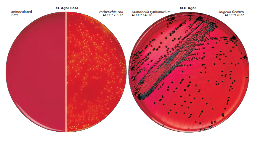 다양한 배지가 개발되어 장내 병원체의 선택적 분리 및 구별을 돕기 위해 사용되고 있습니다. 다양한 영양 요구 및 화학적 저항성 패턴을 가진 다양한 미생물 종 및 균주로 인해 연구원들은 미생물의 분리 및 식별에 관한 일반 및 특수한 요구 사항을 충족시키기 위해 다양한 조성을 개발해 왔습니다. XL Agar Base는 Taylor에 의해 만들어진 것으로, 음극성 장내 배양균의 비선택적인 분리 및 구별을 위해 권장되며, 특히 장내 미생물의 수를 확인하는데 적합합니다. 이 매체는 Sodium desoxycholate(2.5 g/L)를 첨가하여 장내 병원체, 특히 시게라에 대해 중간 정도로 선택적으로 만들 수 있습니다. XL Agar Base는 고압 멸균 전에 기존 배지에 1%의 수용성 브릴리언트 그린(1.25 mL/L)을 첨가함으로써 살모넬라에게 선택적으로 만들 수 있습니다. 이것은 음식 분석에서 셀레나이트 또는 테트라티온 확대 후 살모넬라 분리에 권장됩니다. 둘 다 대장균과 시게라를 억제시킵니다. Taylor에 의해 개발된 XLD Agar는 특히 시게라를 중심으로 장내 병원체의 분리 및 식별의 효율성을 높이기 위해 만들어졌습니다. 병원체는 비병원성 락토스 발효균과 다르게 락토스 또는 슈크로스를 발효하지 않는 다양한 비병원성 균으로부터 구별됩니다. 게다가, 이 매체는 과도하게 독성을 가진 억제제를 포함하여 다른 조성물에서 종종 성장하지 못한 미생물의 성장 빈도를 증가시키기 위해 조성되었습니다. 임상 평가에서 얻은 결과는 XLD Agar의 상대적으로 높은 시게라 및 살모넬라의 일차 분리 효율을 지지하고 있습니다. XLD Agar는 임상 검체에서 장내 병원체를 분리 및 구별하기 위해 사용되는 선택적 및 차별적인 매체입니다. XLD Agar의 임상 실험실에서의 가치는 매체가 특히 시게라와 같은 섬세한 장내 미생물을 지원하는데 더 효과적이기 때문입니다. 또한 XLD Agar는 다양한 산업 표준 시험 방법에서 음식, 유제품 및 물의 테스트에 권장됩니다. 미국 의약규격의 일반 장 <62>은 XLD Agar를 고체 배양 배지로 사용하여 비살균 의약품에서 살모넬라를 분리하기 위한 시험 방법을 기술하고 있습니다.